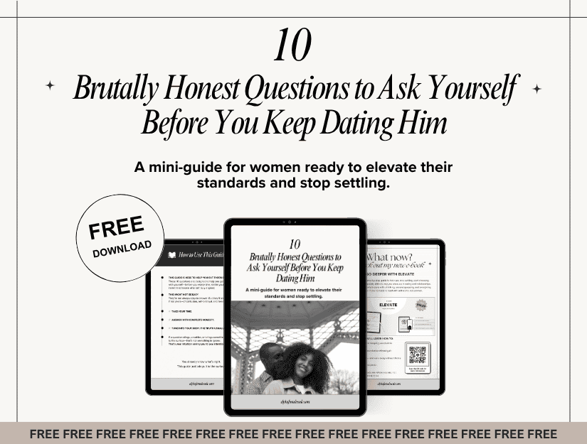 just for you because you deserve to feel empowered Free Resources 01 MINI GUIDES 02 MASTER CLASSES GET STARTED MINI GUIDES 01 10 Brutally Honest Questions Before You Keep Dating Him: STOP SETTLING FOR POTENTIAL. START CHOOSING YOURSELF.10 Yes-or-No Questions to Help You:Get honest about who he really isStop overgiving or ignoring your needsRecognise when you’re dating from fear, not self-worthThis free guide is your wake-up call before you give more energy to the wrong man.If something has felt off lately—trust that feeling. FREEDOWNLOAD NOW